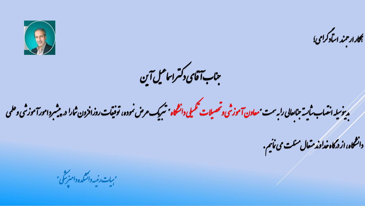انتصاب جناب آقای دکتر اسماعیل آین به سمت معاون محترم آموزشی و تحصیلات تکمیلی دانشگاه 04 خرداد - 1404 | r.gholami گروه آموزشی: دانشکدهتصویر برای خبر یا اطلاعیه: