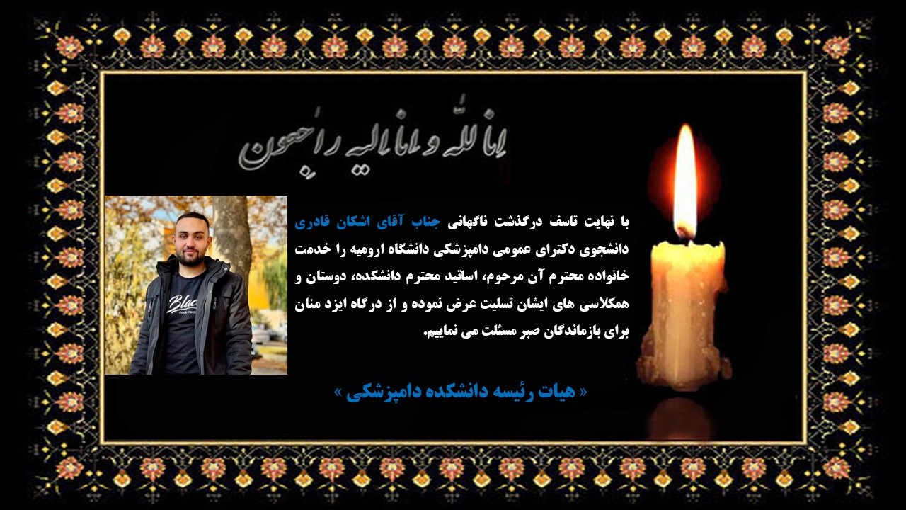 درگذشت ناگهانی جناب آقای اشکان قادری دانشجوی دکترای عمومی دامپزشکی دانشگاه ارومیه 02 دى - 1404 | r.gholami گروه آموزشی: دانشکدهتصویر برای خبر یا اطلاعیه: